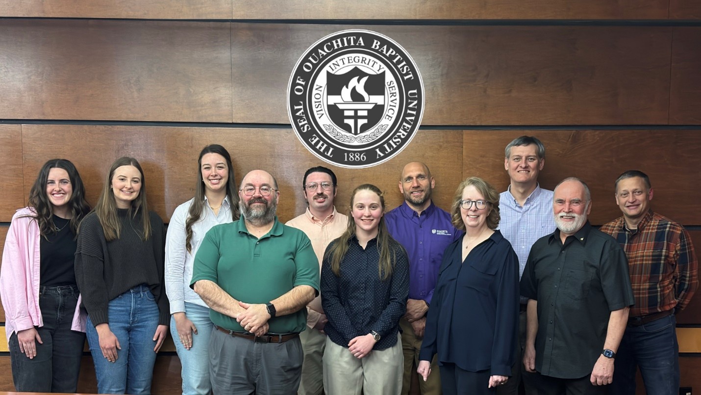 The installation of the Arkansas Delta Chapter of Kappa Mu Epsilon was held in the Hampton Board Room on the Ouachita Baptist University campus on Thursday, March 6, 2025, at 4:30 in the afternoon. KME National President Don Tosh was the installing officer. Faculty member Debra Coventry will serve as the chapter's Corresponding Secretary and Faculty Sponsor. During the ceremony, new members were initiated and officers were installed. Each initiate was invited to sign the Chapter Roll, and was presented with a membership certificate and a KME pin. Don Tosh declared the organization to be the Arkansas Delta Chapter of Kappa Mu Epsilon, and presented the chapter's crest to the President. Charter members are pictured above. From left to right back row: Abby Moseley, Tatum Smith, Rachel New, Jarrett Hornsby, Scott Anderson, Jeff Matocha, Darin Buscher. From left to right front row: Jeffery Sykes, Lizzie Horton, Debra Coventry, Don Tosh. Not pictured: Ian Redman Aguilar, Caleb Wooten. A time of congratulations and fellowship with refreshments was enjoyed by all following the installation ceremony.